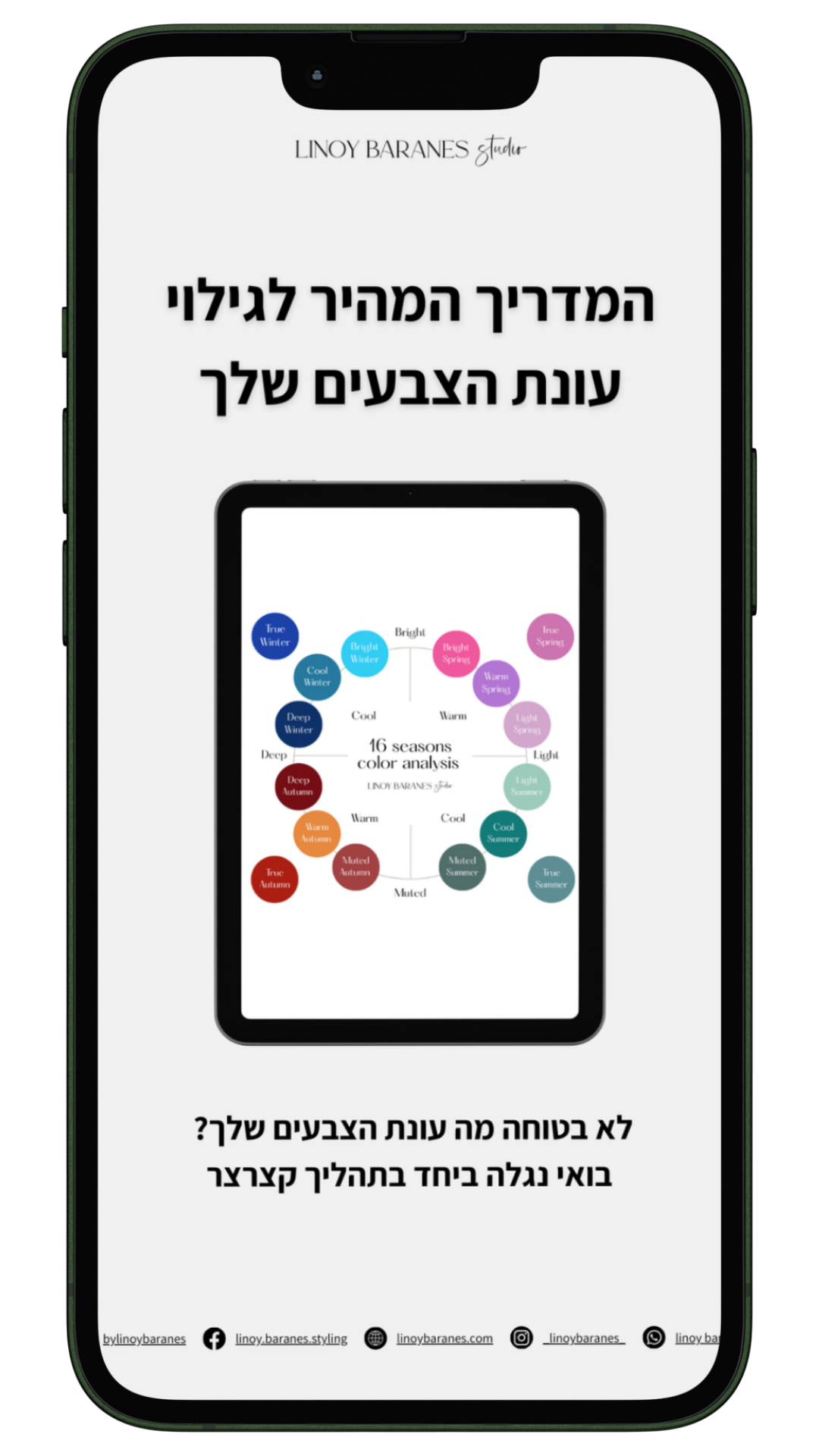 במדריך החינמי שלי תלמדי לזהות את עונת הצבעים שלך בשיטת Color Analysis – 16 העונות, בצורה פשוטה, ברורה ויישומית.